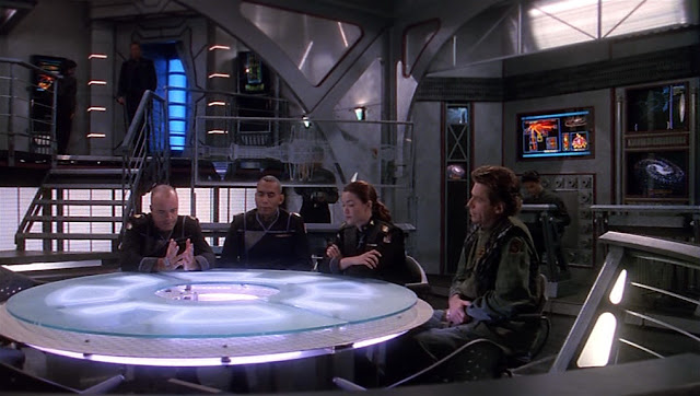 Plus it turns out that Garibaldi didn't need worry about the Captain being excluded from their scrutiny, because as soon as he leaves Sheridan comes in asking if his own test results are ready. But the camera doesn't follow them, instead it zooms into a TV where Ivanova's doing her newsreader thing again.